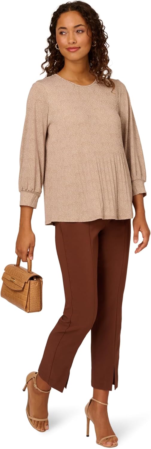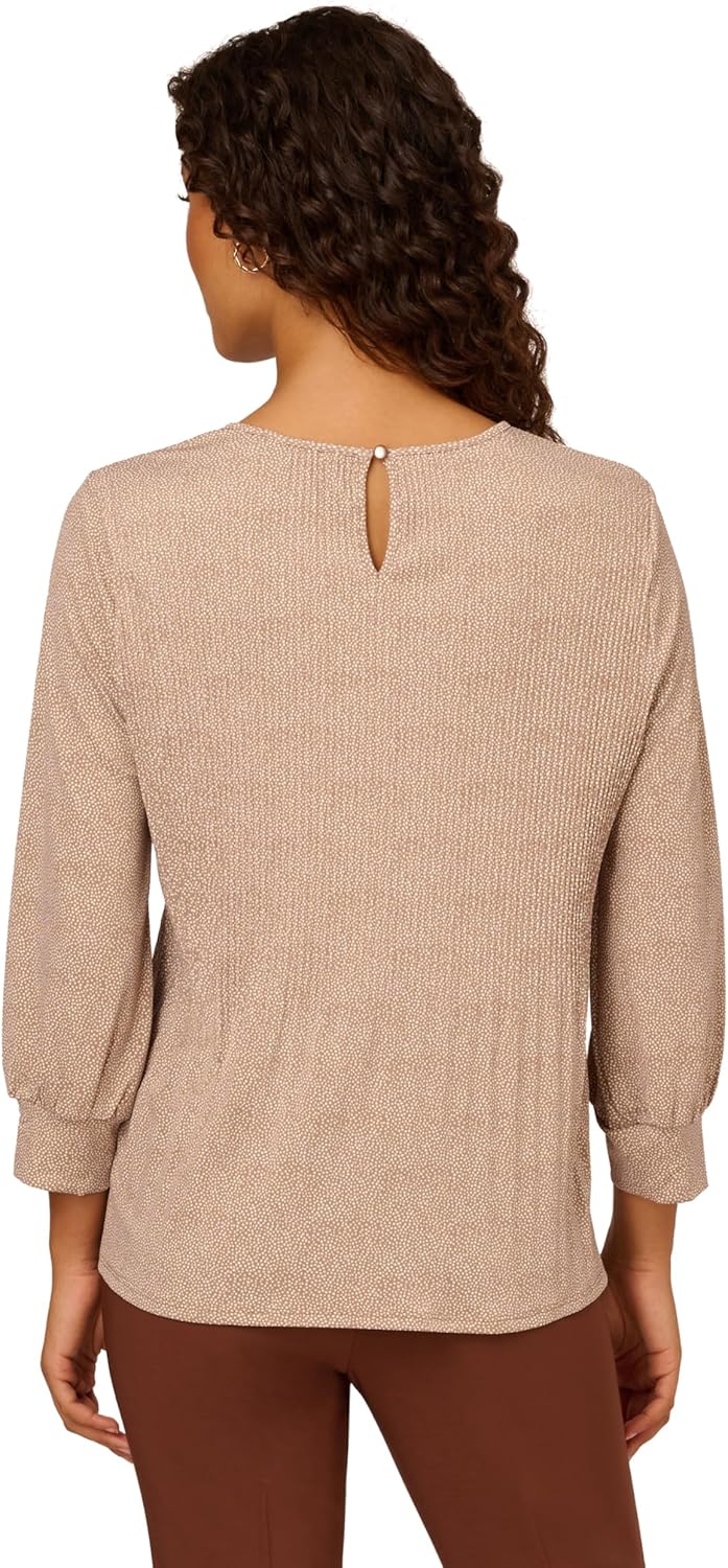 Dressy blouse in comfortable knit crepeThis review is for Adrianna Papell Women’s Print Knit Pleated Trapeze Top (Medium, Ivory/Black Confetti). This blouse has a bound neckline with back keyhole buttoned opening and 3/4 sleeves with cuffs. The material is a medium-weight stretchy knit crepe and is comfortable to wear. The sizing runs a little large. The style is more fitted at shoulders and wider around the middle to skim over figure. Appropriate for business wear or with black jeans or leggings.