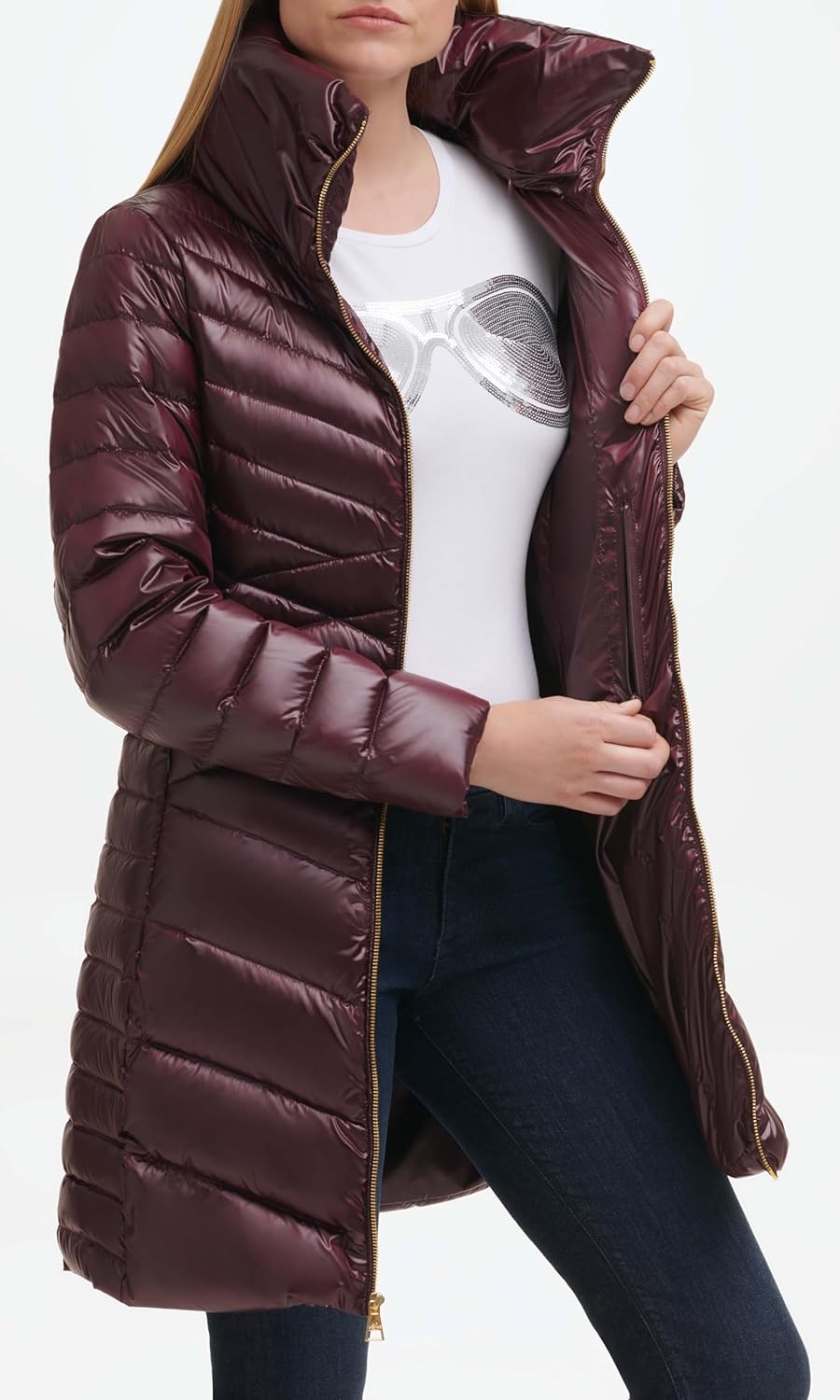 This Karl Lagerfeld Paris Women’s Outerwear OUTERWEAR is a Filler 60% down, 40% feather. Removable hood. Knit storm cuffs. Zippers at side seams.